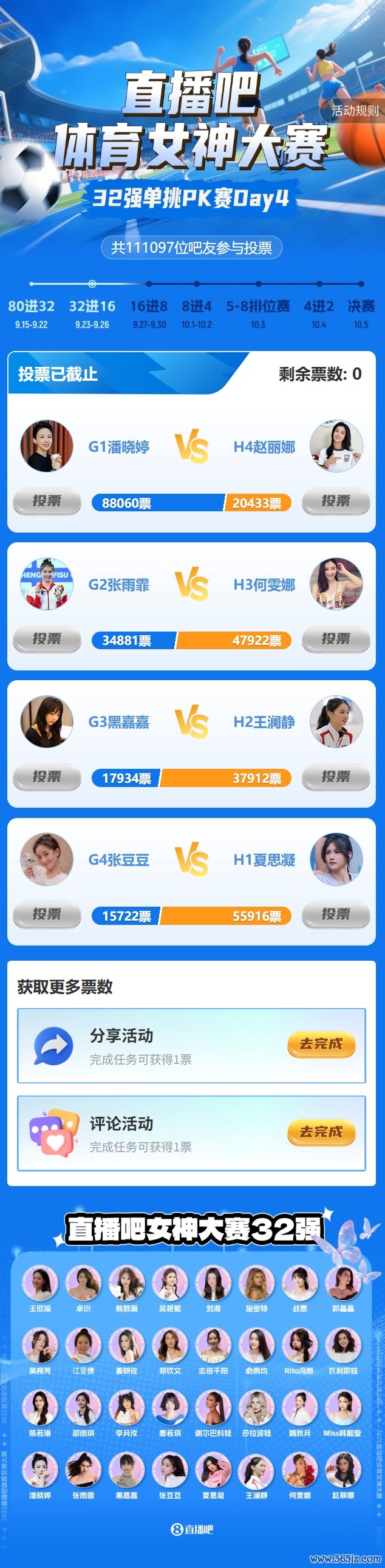 2025年『体育女神大赛』32强单挑PK赛最后一日结束,出回合赛Day4(G组、H组)结果如下: