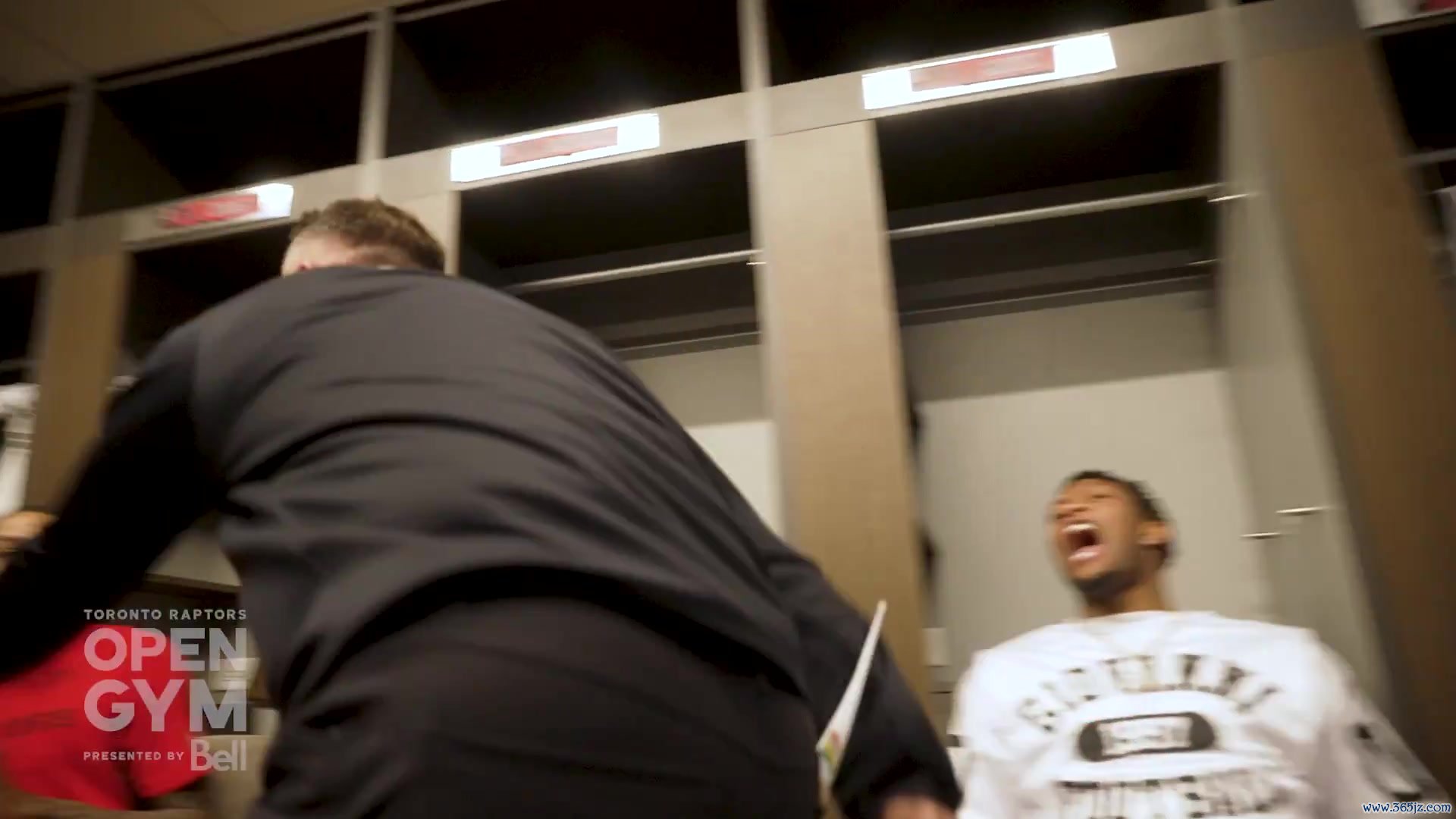 10月23日讯 今天猛龙138-118老鹰取得赛季开门红,主指导教练员达科-拉贾科维奇心情大好,赛后在更衣室里热血 向球员中怒吼并疯狂庆祝,离他最近的斯科蒂-巴恩斯被吓得缩成一团。