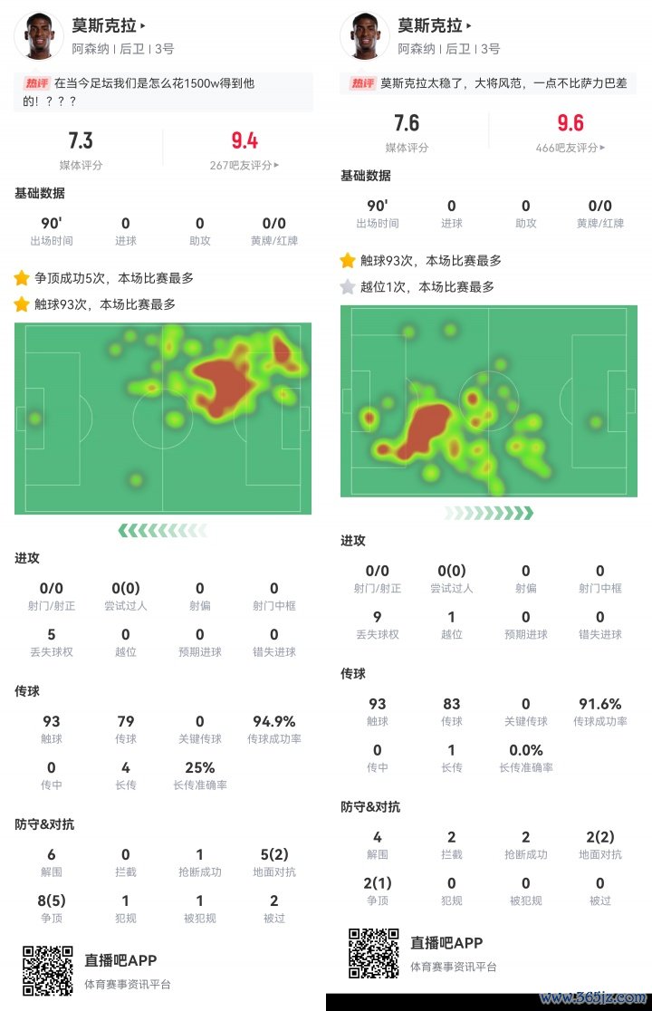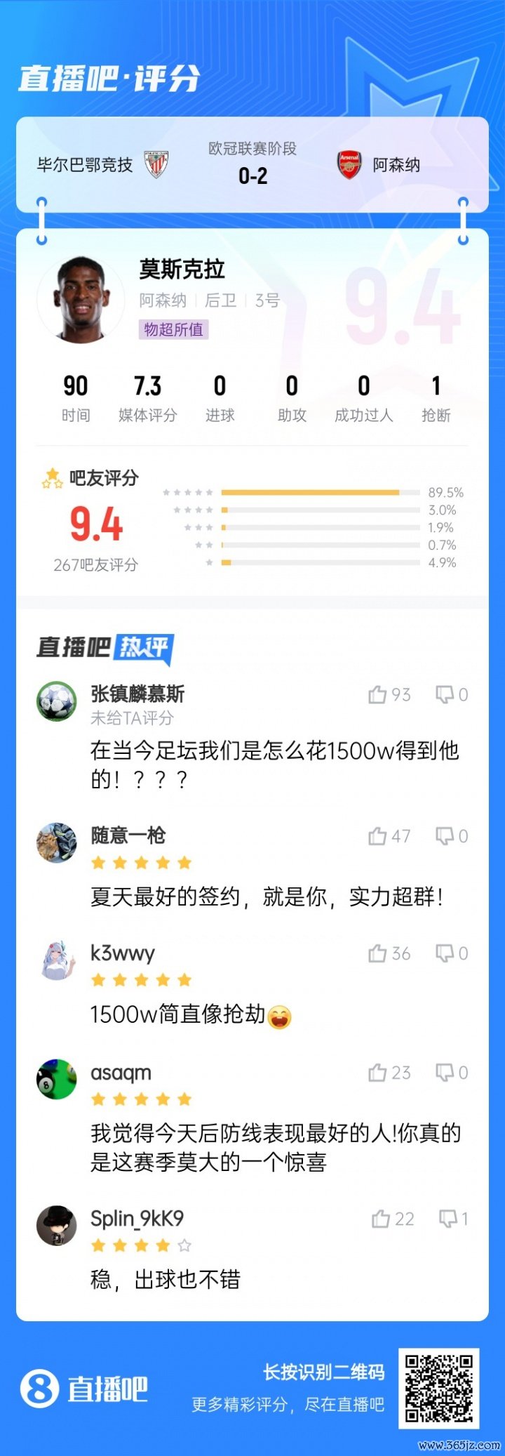 凌晨欧冠首轮,阿森纳客场2-0战胜毕尔巴鄂竞技,本场比赛莫斯克拉与加布里埃尔搭档中卫,前者交出了满分表现。枪手球迷给他打出了9.4分的高分。
