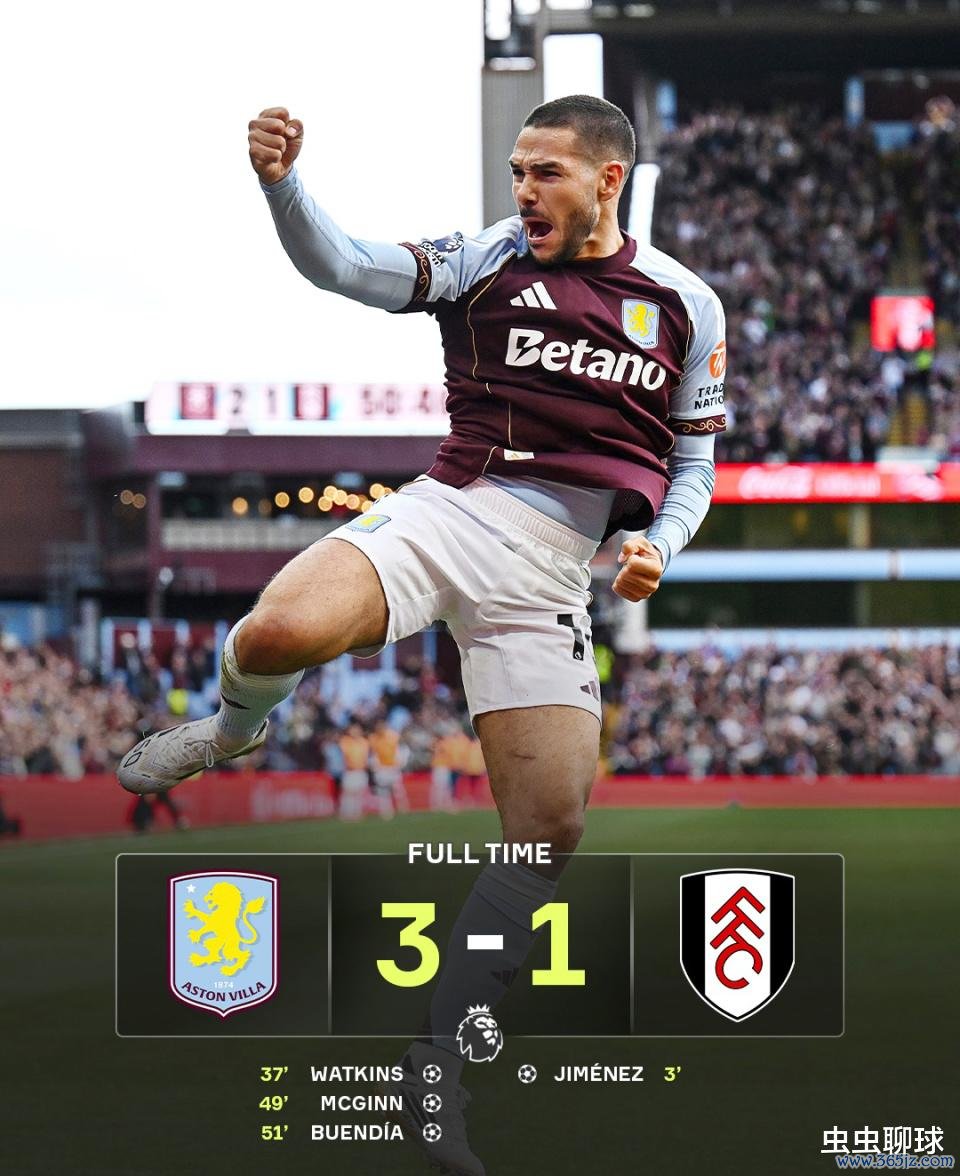 仅仅过了2分钟,刚刚替补登场的布恩迪亚抓住机会,在禁区中路劲射破门,将比分扩大为3-1!3分钟连进两球,主场球迷陷入狂欢,这一刻等了近一个月啊英超20242025积分榜最新积分榜,终于有一场球打入3球啦,看来首胜有戏啦。随后富勒姆玩命反扑,但是面对士气正旺的维拉,外加上大马丁横刀立马在那,最终只能接受1-3败北,目送维拉收获联赛首胜。各项赛事2连胜,这也让埃梅里的执教压力暂时缓解。