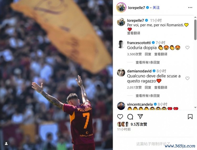 9月22日讯 昨晚,罗马在德比战1-0击败拉齐奥,洛伦佐-佩莱格里尼赛后发文庆祝, AC米兰罗马名宿托蒂也在评论区现身。