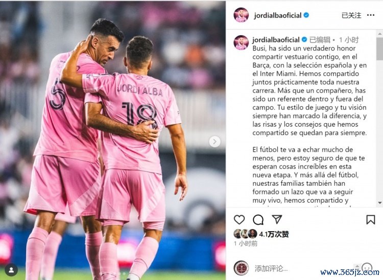 阿尔巴社媒晒出与布斯克茨的合照,并写道:“布斯克茨,能与你在巴萨、西班牙队以及迈阿密国际共用更衣室,这是我的莫大荣幸。我们几乎整个职业生涯都并肩作战。你不仅是队友,马赛更是场上场下的榜样。你的球风与视野始终独树一帜,