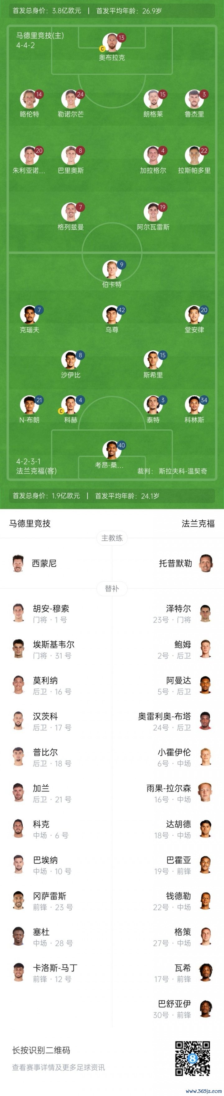 马竞vs法兰克福首发:格列兹曼搭档阿尔瓦雷斯 小西蒙尼先发