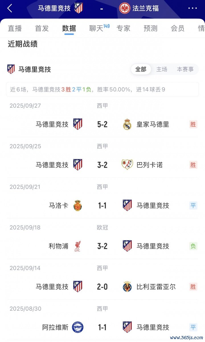 欧冠首轮比赛,马竞客场2-3不敌利物浦;法兰克福主场5-1大胜加拉塔萨雷!