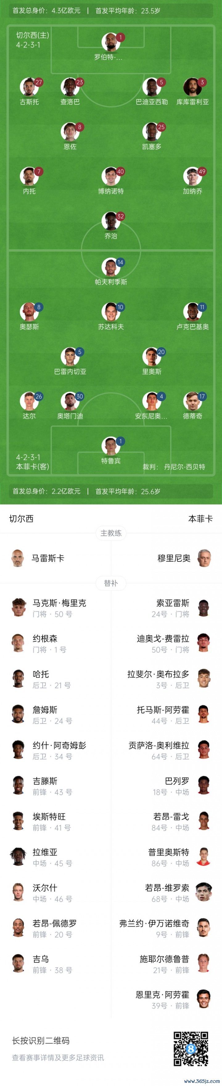 切尔西首发:1-桑切斯、3-库库雷利亚、5-巴迪亚西勒、23-查洛巴、27-古斯托、8-恩佐、25-凯塞多、40-博纳诺特、7-内托、32-乔治、49-加纳乔