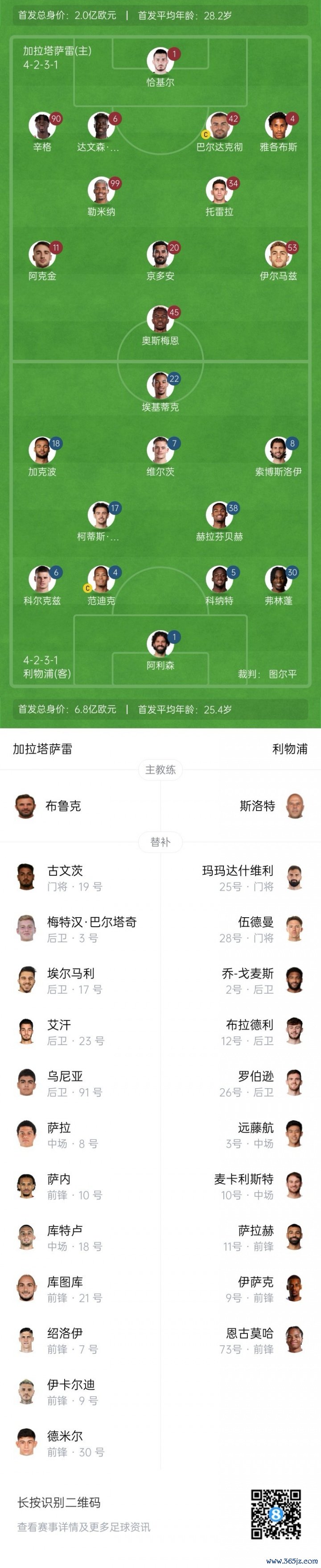 加拉塔萨雷首发:1-恰基尔、90-辛格、6-达文森·桑切斯、42-巴尔达什彻、4-伊斯梅尔-雅各布斯、34-托雷拉、99-勒米纳、11-阿克金、20-京多安、53-伊尔马兹、45-奥斯梅恩