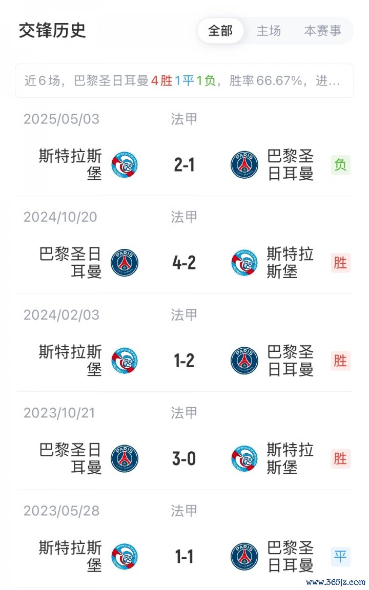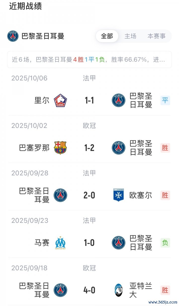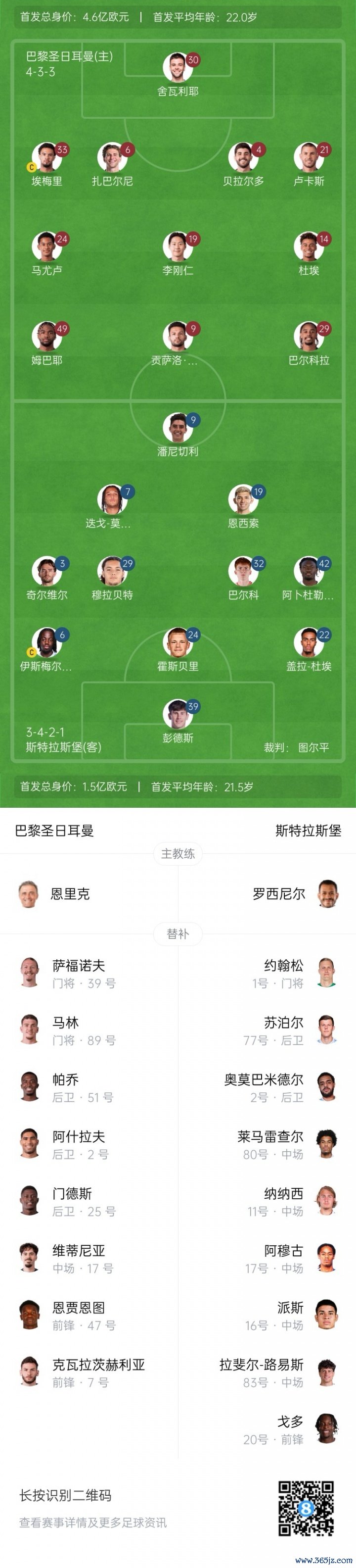 巴黎vs斯特拉斯堡首发:杜埃、巴尔科拉、李刚仁出战
