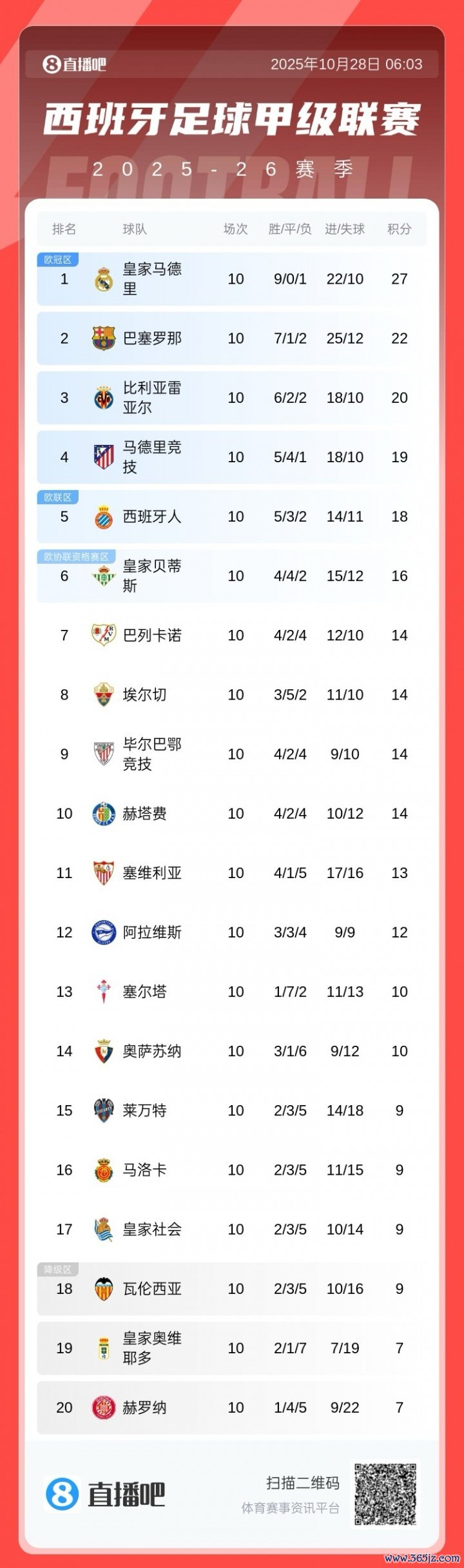 西甲积分榜:皇马10轮领先巴萨5分,黄潜第三,马竞第四