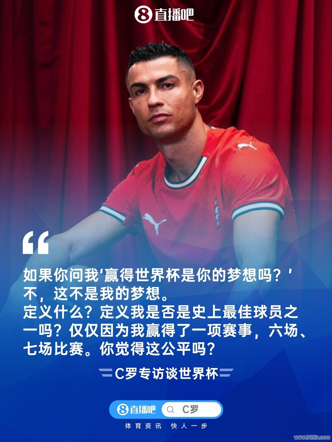 C罗:这也太好了,我没想过好到这样的梦(笑)。你可以说其他人进球,我不在乎,如果是葡萄牙进世界杯决赛,直播吧哪怕是门将进球,我也是世界上最开心的人。