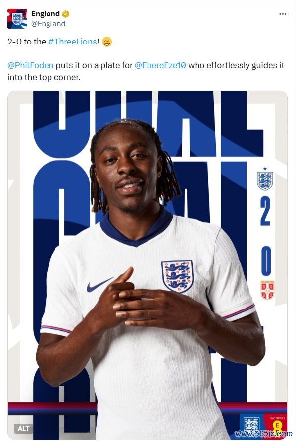 英格兰2-0击败塞尔维亚,埃泽在第90分钟破门锁定胜局,英格兰队官方的进球描述却引发了一众英国球迷的吐槽。