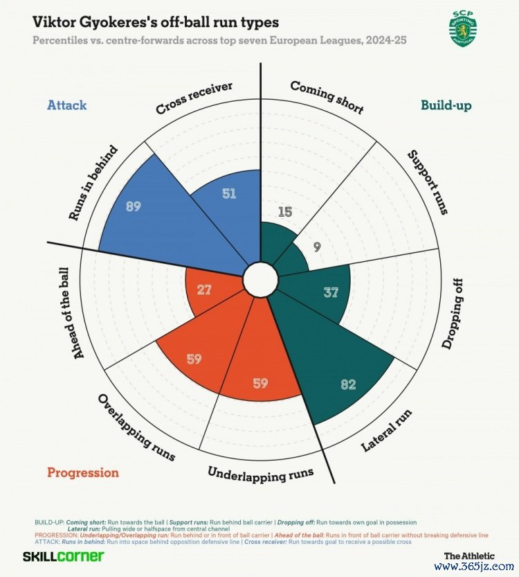 然而,约克雷斯的价值远不止于此。他不仅擅长精准射球 和危险区域 内的抢点,还是一名出色的跑动者,速度快、瞬间力量 强,并且具备在高强度下反复冲刺跑 的能力。 通过SkillCorner的跑动数据解读 可以看出, 田径新闻与欧洲顶级七职业联赛 中的其他前场球员相比, AC米兰约克雷斯经常瞄准对方防线身后的空间,马赛或者拉边跑动,乐于带球冲破 防卫 后内切射球 。