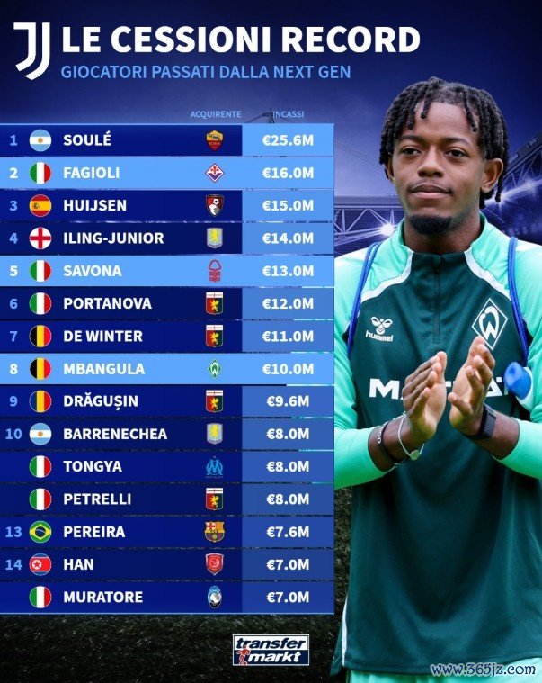 9月12日讯 德转统计了尤文新生代球员卖人榜,苏莱2560万欧加盟罗马居首,马赛英超直播法乔利、赫伊森分居二三位。