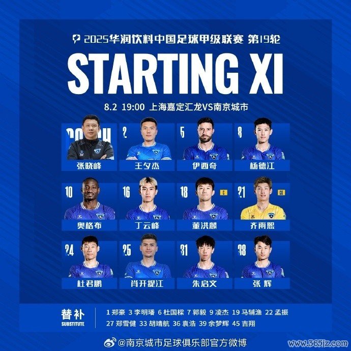 中甲职业联赛 第19轮 上海嘉定汇龙VS南京城市 杆位名单出炉