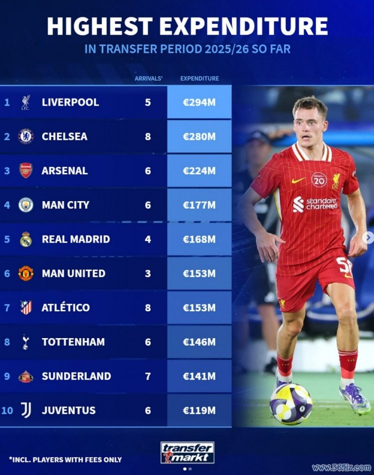 目前夏窗引援花费榜:利物浦签5人2.94亿欧居首,前四均来自英超
