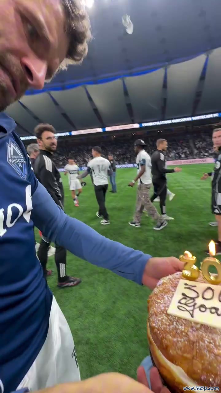 穆勒此役为温哥华白浪点射破门, 田径新闻攻入职业生涯第300球, AC米兰英超直播赛后温哥华白浪俱乐部为穆勒送上纪念蛋糕,马赛祝贺他达成这一里程碑。