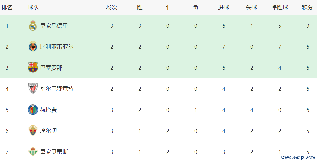 在积分榜上中超联赛直播,3战全胜的皇马以9分暂时登上榜首位置。比利亚雷亚尔、巴萨、毕尔巴鄂竞赛 和赫塔费都是6个积分。其中比利亚雷亚尔、巴萨和毕尔巴鄂竞赛 都只踢了2轮。埃尔切和皇家贝蒂斯拿到5分,排名第6和第7。