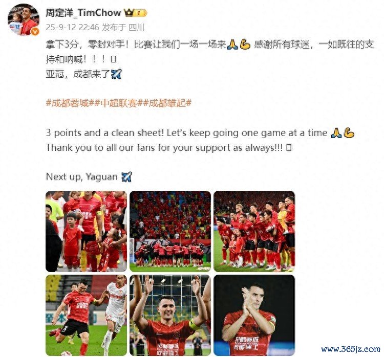 直播吧9月12日讯 中超职业联赛 第24轮,成都蓉城主场作战 1-0击败长春亚泰。赛后,蓉城球员周定洋发文庆祝获胜 。