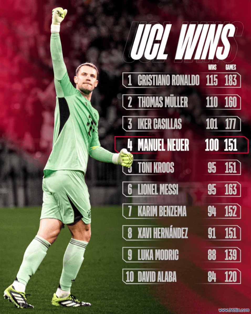 欧冠胜场数排行: C罗115胜居首, 诺伊尔第四, 梅西95胜
