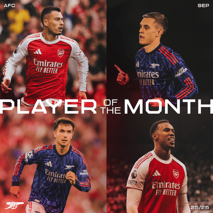 虎扑10月05日讯阿森纳官方公布9月最佳球员候选,加布里埃尔-马丁内利、特罗萨德、苏比门迪、加布里埃尔。