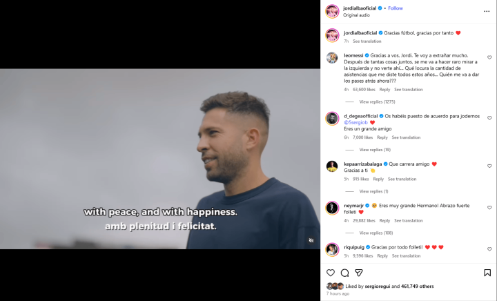 虎扑10月07日讯迈阿密国际后场球员阿尔巴在个人社交媒体宣布,将在迈阿密国际本赛季结束后挂靴。随后与他共事多年的梅西在阿尔巴的这条更新下留言,表达了对他的感谢。