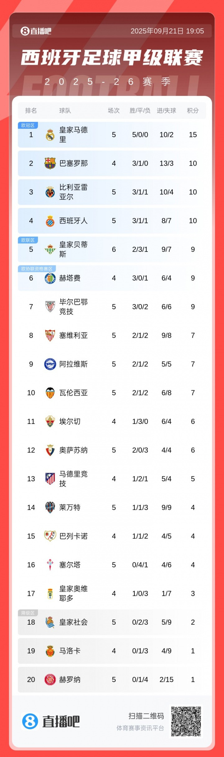 直播吧09月21日讯 西甲第5轮,赫罗纳主场作战 0-4大败 于莱万特,继续稳居西甲垫底位置。本赛季西甲前5轮,赫罗纳仅取得1平4负,排名西甲倒数第一。
