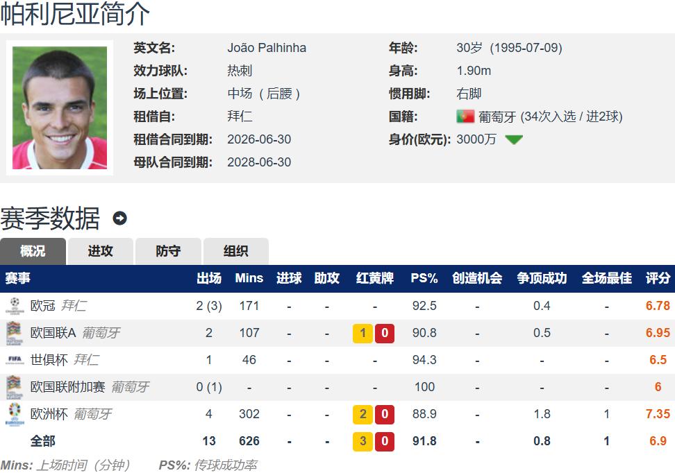 三十而立的帕利尼亚,身高1.90米,右脚球员,主打后腰位置,与拜仁的合同至2028年,德转估价3000万欧元。帕利尼亚上赛季各项赛事共为拜仁出场24次,其中仅有9次杆位,合计出场才941分钟;2025世俱杯仅出场一次2025-2026亚冠完整赛程公布,半场就被换下。